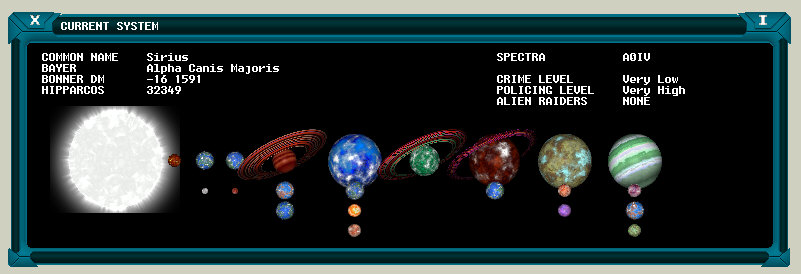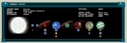 Left clicking on a planet or the central sun in either the main screen or system window will cause a ‘Selected Planetary Body’ window to appear. This window displays various information concerning the selected object.