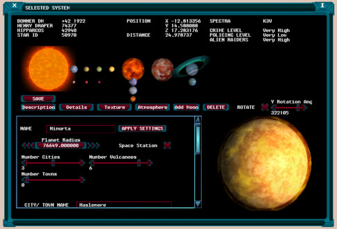 Selecting a planet will allow its basic details to be changed. As shown in the figure below it is possible to specify the planets name, its radius, number of cities/ towns/ volcanoes and also to indicate whether a Space Station is present. Once the desired configuration has been specified then the ‘Apply Settings’ button should be pressed otherwise they will be lost.
