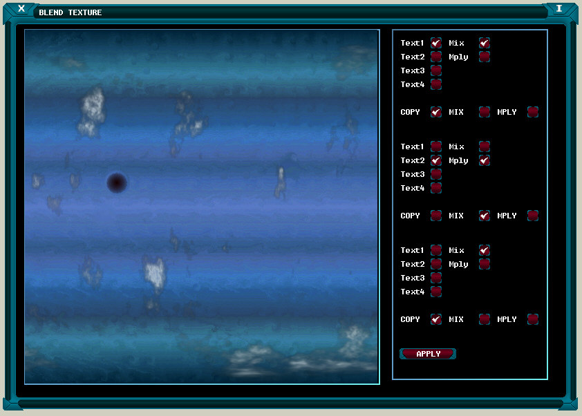 The Blending Window is illustrated below and allows each of the four possible sub textures to be blended into a single one.