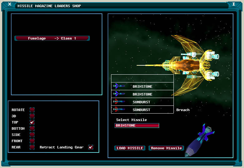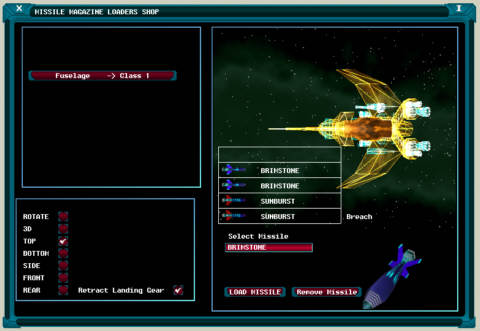 When a missile has been bought it is transferred into the cargo bay. In order to allow the missile to be fired then it must be loaded into one of the Spacecrafts magazines by entering the Missile Loaders’ Shop. Referring to the illustration which shows a typical screen where the area on the left displays a list of the Ships Magazines, which once selected will be displayed on the right. The magazine is displayed as a series of boxes where the firing position is located at the bottom. A list of the missiles that are held in the Cargo Bay which are compatible with the selected magazine are displayed below this together with a pair of buttons which allows the ordnance to be added or removed.