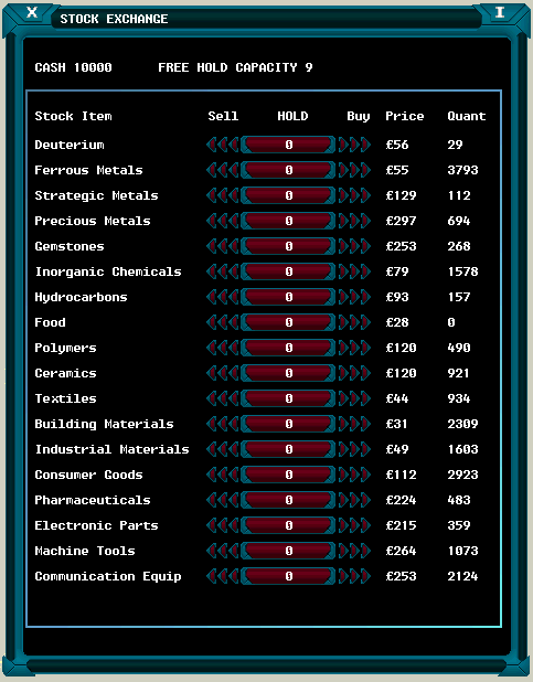 A typical Stock Exchange window is shown above. Your Cash reserves and free hold capacity are displayed at the top of the screen and below these appears a list of the available Stock.