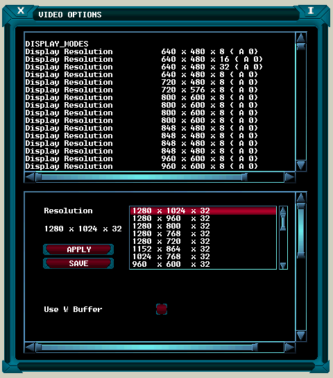The ‘W Buffer’ option selects W buffering as opposed to standard Z buffering and in theory should produce superior results. A W/ Z buffer is used to remove pixels that are obscured by others that are closer to the observer. A Z buffer works well for objects that are relatively close to the viewer and is generally fine for games such as first person shooters. For applications that need to compute large distances, such as space games then a Z buffer will tend to struggle and artefacts can occur. In principle the W buffer should work better where larger distances are involved, however in practice the results tend to be marginal.