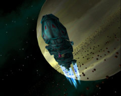 Originally commissioned by a consortium of Deuterium refiners as a fuel tanker, the Leviathan is one of the largest freighters ever built. Its hull compartments originally designed for holding liquids, have subsequently been modified by the manufacturer as demand for a huge bulk transport of other commodities has escalated. Its massive size and formidable weapon deployment make the Leviathan an intimidating sight and many pirates give it a wide berth despite the tempting value of its cargo. |